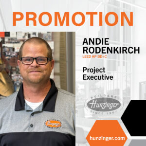 Andie Rodenkirch was promoted to Project Executive. Andie is a 24-year Hunzinger veteran who has risen in the project management ranks to SPM and recently completed Komatsu’s South Harbor Campus where his role was manage the site development while working closely with Komatsu’s Smart Construction Division. The 58-acre Komatsu construction site was rendered a brownfield by successive industrial users, but such working conditions are not unfamiliar to Andie who had been on several sites like this. After Komatsu, he was the SPM on GEA in Janesville. GEA was a new 86,000 SF building that included office space and a training center for customers and employees, a repair shop for mechanical equipment and loading docks with additional office space to service logistics. The new facility features numerous measures to make it a net-zero facility including a high efficiency heating and cooling system, solar panels, LED lighting, electric car charging stations, recycling, and water reuse possibilities.