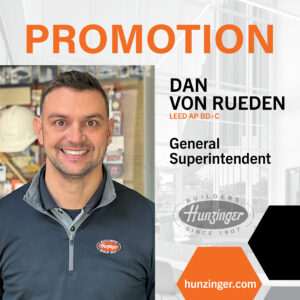 Dan Von Rueden was promoted to General Superintendent. DVR has been with Hunzinger over a dozen years as the Superintendent that we would turn to for tough, high-profile jobs from The Deer District to multiple projects on the Summerfest Grounds including overhauling the American Family Amphitheater and lifting its roof to building Komatsu’s new headquarters, he led some of Milwaukee’s most complex projects. Then came the $80 million Milwaukee Repertory Theater Project where he and the team were tested but through his leadership, perseverance, and sheer will, successfully completed the project on time!