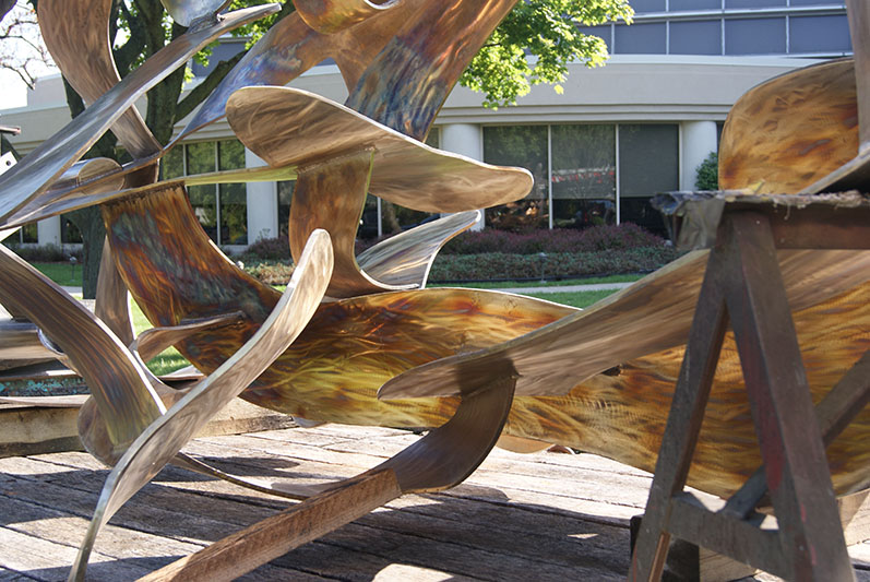 Congregation Shalom Sculptures are located at 7630 N. Santa Monica Boulevard in Fox Point, WI. Hunzinger Construction Company was hired as the general contractor for the site preparation, foundation pours, and the erection of these two 25 foot tall magnificent metal sculptures entitled, Pillar of Cloud, Pillar of Fire. Congregant Richard Edelman was commissioned to create a work that represented text from The Book of Exodus which states that when the Israelites wandered through the wilderness they were led by a Pillar of Cloud by Day and a Pillar of Fire by Night.