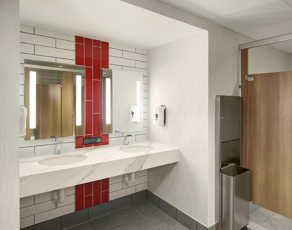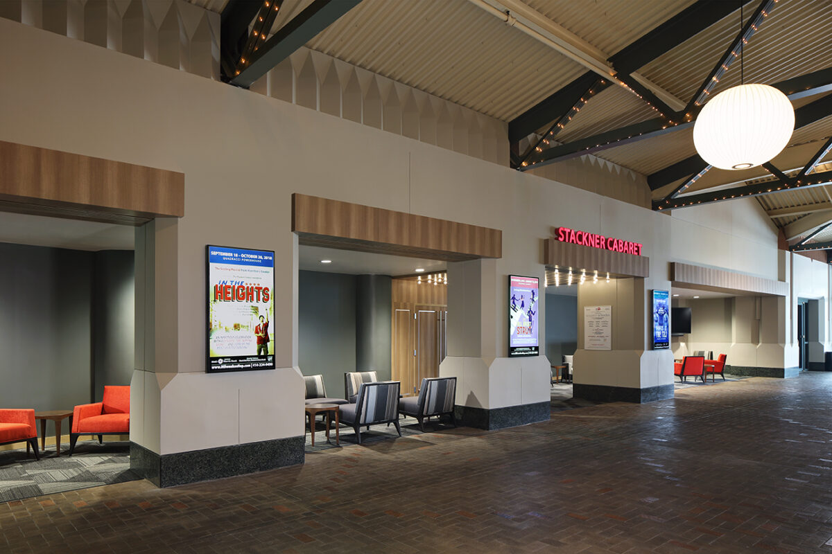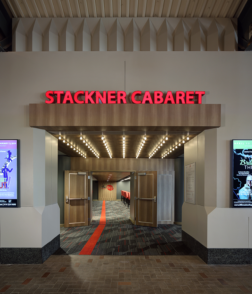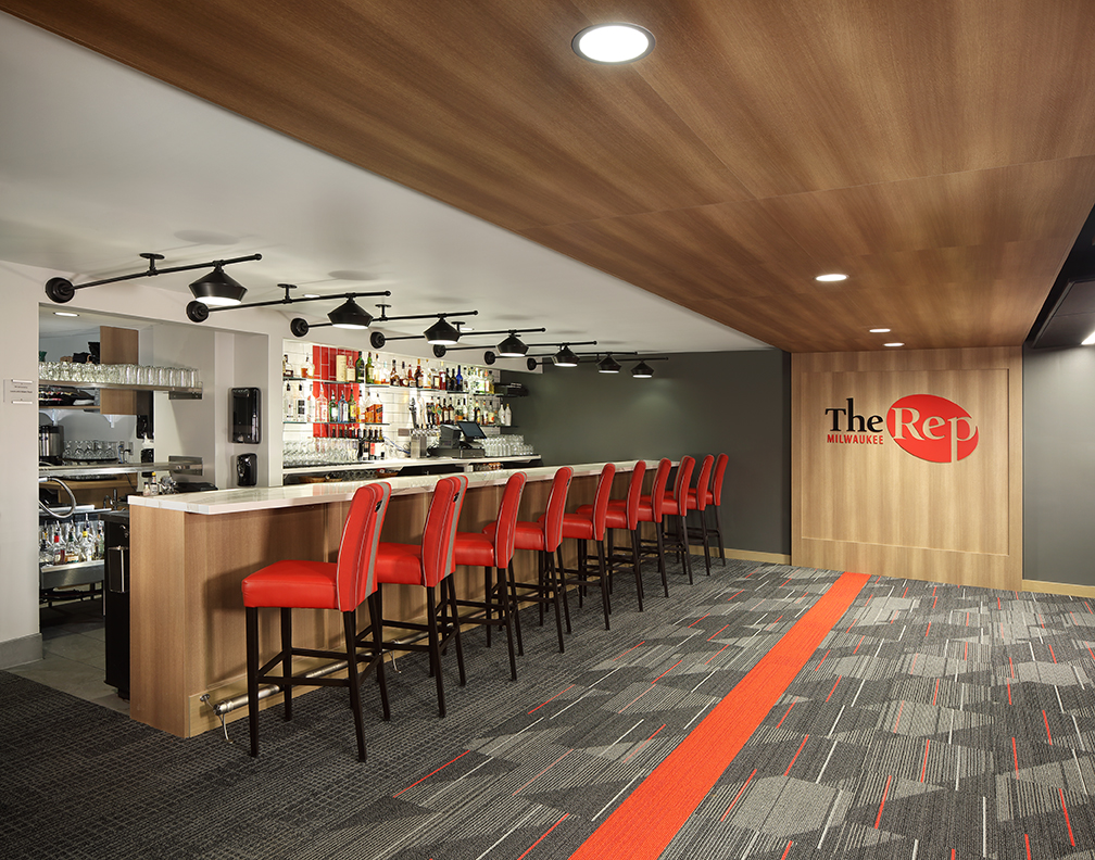 Milwaukee Repertory Theater Stackner Cabaret is located at 108 E Wells Street in downtown Milwaukee. Hunzinger Construction Company served as Construction Manager Advisor for the 6,600 SF project. Ramlow Stein Architects + Interiors (formerly Uihlein Wilson Architects) designed this interior refresh to the lobby which included new carpeting, new wood panel ceiling, marque lighting, lounge seating, a new video screen and a new mobile bar.