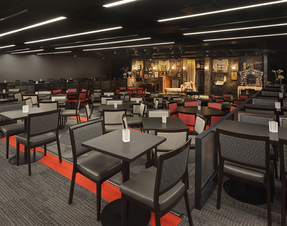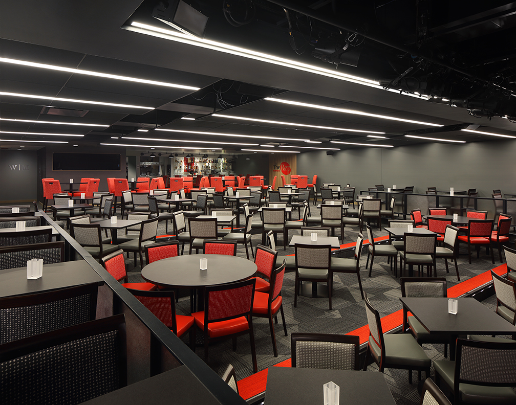 The theater increased it’s seating capacity by 35% and gained better site lines as columns were removed. Along with new carpeting and a fresh coat of paint, new acoustic cloud panels were added on the ceiling for improved sound quality. The main bar and bathrooms were relocated. In addition, the commercial kitchen added all new appliances as well as a new layout to provide greater comfort and convenience for the increase number of patrons.